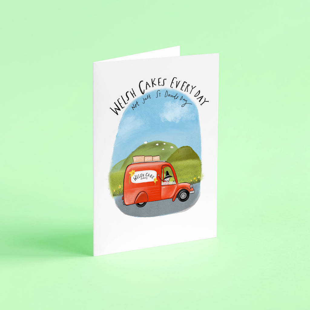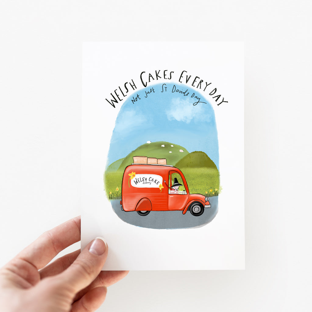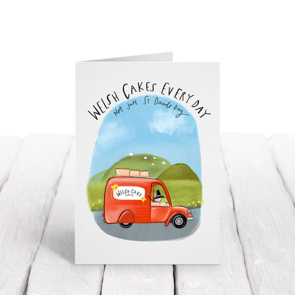 This illustrated card features the Welsh Cake Delivery Van, trundling through rolling green hills with a precious cargo of freshly baked Welsh cakes. Topped with the cheerful phrase: